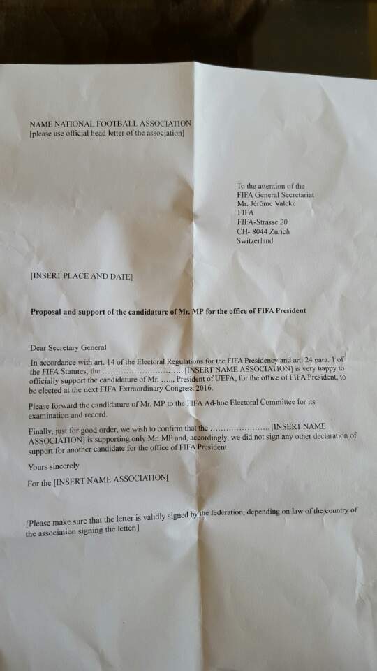 The letter is a form letter to be filled in by the National Football Association supporting the candidacy of Mr. Michel Platini and addressed to FIFA’s Secretary General. It is entitled “Proposal and support of the candidature of Mr. MP [Michel Platini] for the office of FIFA President.” The purpose of the letter is clearly defined as “support of the candidature of Mr. MP for the office of FIFA President, to be elected at the next FIFA Extraordinary Congress 2016.” It further states that “…just for good order, we wish to confirm that [INSERT NAME ASSOCIATION] is supporting only MR. MP and, accordingly, we did not sign any other declaration of support for another candidate for the office of FIFA President.”